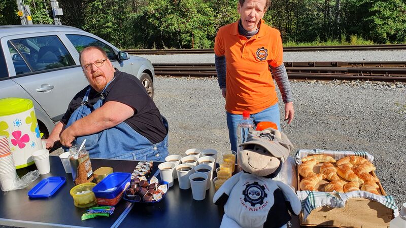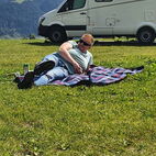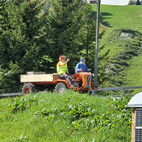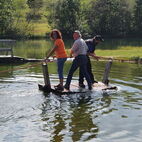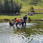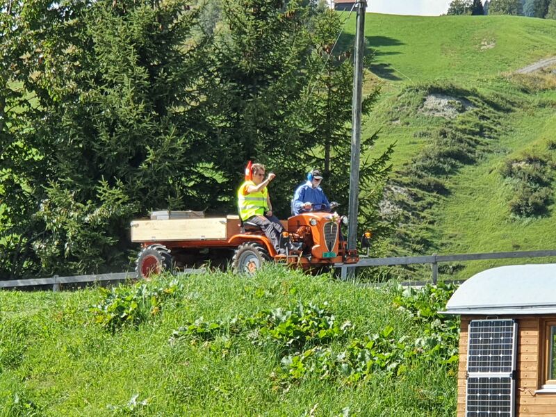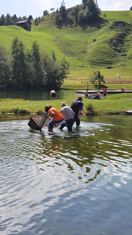 Das Floss, über den kleinen Badeteich, musste natürlich noch auf Almatraktauglichkeit überprüft werden. Kurz gesagt, Prüfung nicht bestanden, wobei nicht ganz geklärt ist wessen Schuld es ist, die des Flosses oder des Kapitäns mit seinem Team? Dank des Fahrwindes auf der Rückfahrt trockneten Kleider, Schuhe und Mensch. Nach dem Versamertobel, mitten im Swiss Grand Canyon legten sie einen letzten Kaffeehalt ein. Wie der Tross wuchs, so schrumpfte er auch wieder, bis am Ausgangspunkt wieder nur ein paar wenige übrig blieben.