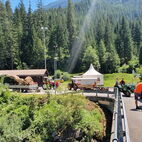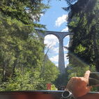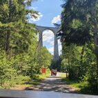 Am Sonntag, nach dem Frühschoppenkonzert, füllten sie die Strassen von Filisur mit ihren sonoren Klängen und starteten direkt mit der Rundfahrt zu dem Wahrzeichen Graubündens, zum imposanten Landwasserviadukt der RHB, besser gesagt zu dessen Fusse. Ein einmaliges Erlebnis, dass wohl niemals mehr wiederholt werden kann. Wahnsinn, wieviele Steine Anfang des neunzehnten Jahrhunderts, aufeinandergestapelt wurden, und es hält immer noch! Hier genossen sie ein paar Minuten. Fotoobjekte gab es zur Genüge.